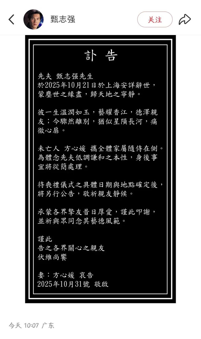 10月31日,前亚视小生、香港演员甄志强的妻子方心媛发布讣告:甄志强在上海辞世,年仅58岁。